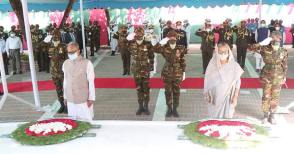 রাষ্ট্রপতি ও প্রধানমন্ত্রী কভিড-১৯ মহামারি পরিস্থিতির কারণে ২০২০ সালের ১৭ মার্চের পর প্রথম বারের মতো সশরীরে টুঙ্গিপাড়ায় বঙ্গবন্ধুর সমাধিতে পুষ্পস্তবক অর্পণ করলেন।