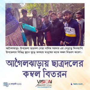 গতকাল মঙ্গলবার দিনব্যাপি উপজেলা ছাত্রদল নেতা নাদিম সরদার এর নেতৃত্বে উপজেলার বিভিন্ন স্থানে ঘুড়ে অসহায় মানুষের মাঝে কম্বল বিতরণ করেণ। এসময় উপস্থিত ছিলেন আগৈলঝাড়া সরকারি কলেজ ছাত্রদলের সভাপতি সাকিব খান, সহ-সভাপতি লিওন কীর্তুনিয়া, যুগ্ম সাধারণ সম্পাদক শাওন আকন, উপজেলা ছাত্রদল নেতা মোঃ খাইরুল ইসলাম, লিমন, রোমান সিকদার, প্রিন্স বক্তিয়ার, নিয়াজ, সাকিব সরদার, অংকন জয়ধর, ইয়াসিন আরাফাত, রাকিব সরদার, কলেজ ছাত্রদল নেতা মমিন, সাব্বির তালুকদার, আগৈলঝাড়া উপজেলা বিএনপি নেতা মোঃ মইন উদ্দিন আকন লিমন, উপজেলা কৃষক দল নেতা মো: দিদার হোসেন প্রমূখ।