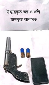 তল্লাশিকালে তার কোমর থেকে একটি লোহার তৈরি দেশীয় একনলা বন্দুক (ওয়ান শ্যুটার গান) এবং পকেট থেকে ০২টি ১২ বোরের কার্তুজ উদ্ধার করা হয়।