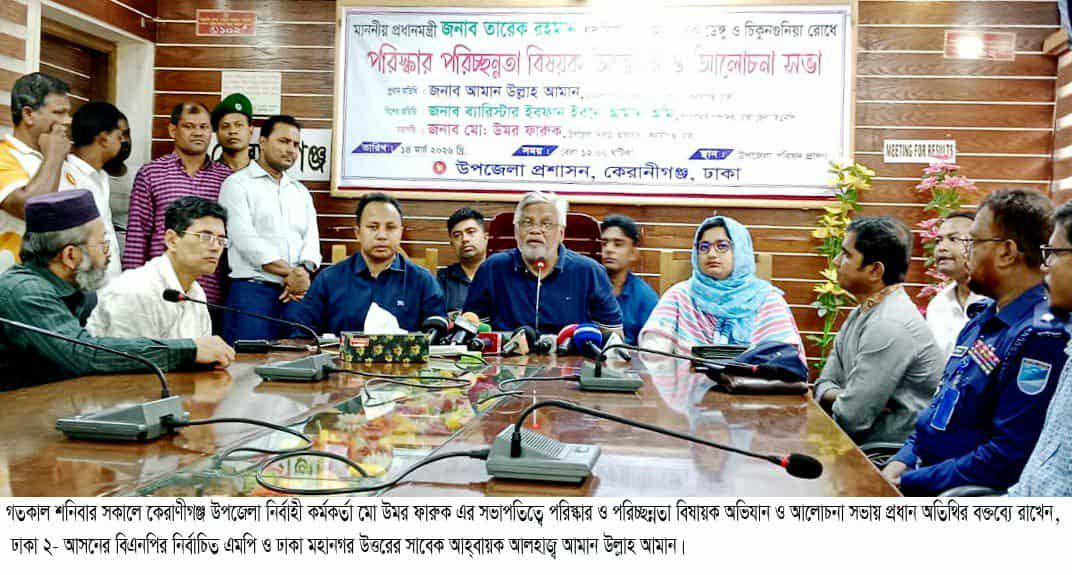 ঢাকা ২- আসনের বিএনপির নির্বাচিত এমপি ও ঢাকা মহানগর উত্তরের সাবেক আহ্বায়ক আলহাজ্ব আমান উল্লাহ আমান বলেছেন, প্রধানমন্ত্রী তারেক রহমানের নির্দেশে দেশ হবে এবার রোগমুক্ত। মাননীয় প্রধানমন্ত্রী তারেক রহমান এর মহতী উদ্যোগে দেশ হবে পরিস্কার, ডেংগু ও চিকনগুনিয়া রোগ মুক্ত। তারেক রহমান নিজেই শনিবার অফিস করেন এতে করে অনান্য অফিসাররা শনিবারে অফিস করতে অনুপ্রেরণা পাচ্ছে। দেশ জুরে যাতে মানুষ ভাল থাকে,তাই তারেক রহমান পরিস্কার পরিচ্ছন্নের উদ্যোগ নিয়েছেন। তিনি আরও বলেন জামা ছিড়া থাক, কিন্তু পরিস্কার থাক। আমান উল্লাহ আমান আরও বলেন, প্রয়োজনে আমি নিজের হাতে ঝাড়ু নিবো কিন্তুু তারেক রহমানের নির্দেশ অমান্য হতে দেব না। আমরা আজ উপজেলা চত্ত্বর পরিস্কার করে এই অভিযানের উদ্বোধন করলাম। আগামী শনিবারে কেরাণীগঞ্জ উপজেলা স্বাস্থ্য কমপ্লেক্সের আশপাশ পরিস্কার করবো। একই সাথে প্রতি শনিবার এই অভিযান অব্যাহত থাকবে। গতকাল শনিবার সকালে কেরাণীগঞ্জ উপজেলা নির্বাহী কর্মকর্তা মো উমর ফারুক এর সভাপতিত্বে পরিস্কার ও পরিচ্ছন্নতা বিষায়ক অভিযান ও আলোচনা সভায় প্রধান অতিথির বক্তব্যে তিনি এইসব কথা বলেন। আমান আরও বলেন, মিডিয়া সমাজের দর্পন। সাংবাদিকদের মাধ্যমে আমাদের ভুল গুলো দেখতে পাই। আমরা জবাবদিহিতা মূলক সরকার প্রতিষ্ঠা করতে চাই। জনাব তারেক রহমান এটাই পছন্দ করেন। মাথা ঠিক থাকলে, হাত পাও ঠিক থাকে। প্রধানউপদেষ্টা ঠিক ছিলো বিদায় অন্তবর্তী কালীন উপদেষ্টা পরিষদ ও ঠিক ছিল। তাদের পরিশ্রমে দেশের মানুষ পেয়েছে একটি শান্তিপূর্ণ ও গ্রহণযোগ্য নির্বাচন। দেশে ফিরেছে গণতন্ত্র। প্রধানমন্ত্রী তারেক রহমানের মহানুভবে দেশের মসজিদের খাদেম সাব,ইমাম সাব, মোহাজ্জিন সাব পাচ্ছেন বেতন। যাহা পূর্বের কোন সরকার করে দেখাতে পারেনি। মা -বোনদের ক্ষমতায়নে প্রধানমন্ত্রী দিয়েছেন ফ্যামিলি কার্ড। কৃষকদের দিবেন কৃষি কাড। এভাবেই প্রধানমন্ত্রী জনাব তারেক রহমান দেশকে একটি স্বচ্ছ ও স্বনির্ভর দেশে পরিণত করবেন। আল্লাহর রহমতে আপনাদের দোয়ায় কেরাণীগঞ্জ ঢাকা- ২ আসনকে একটি সন্ত্রাস মুক্ত, মাদক মুক্ত ও ভূমি দস্যু মুক্ত একটি শান্তির নীড় গড়ে তুলবো।