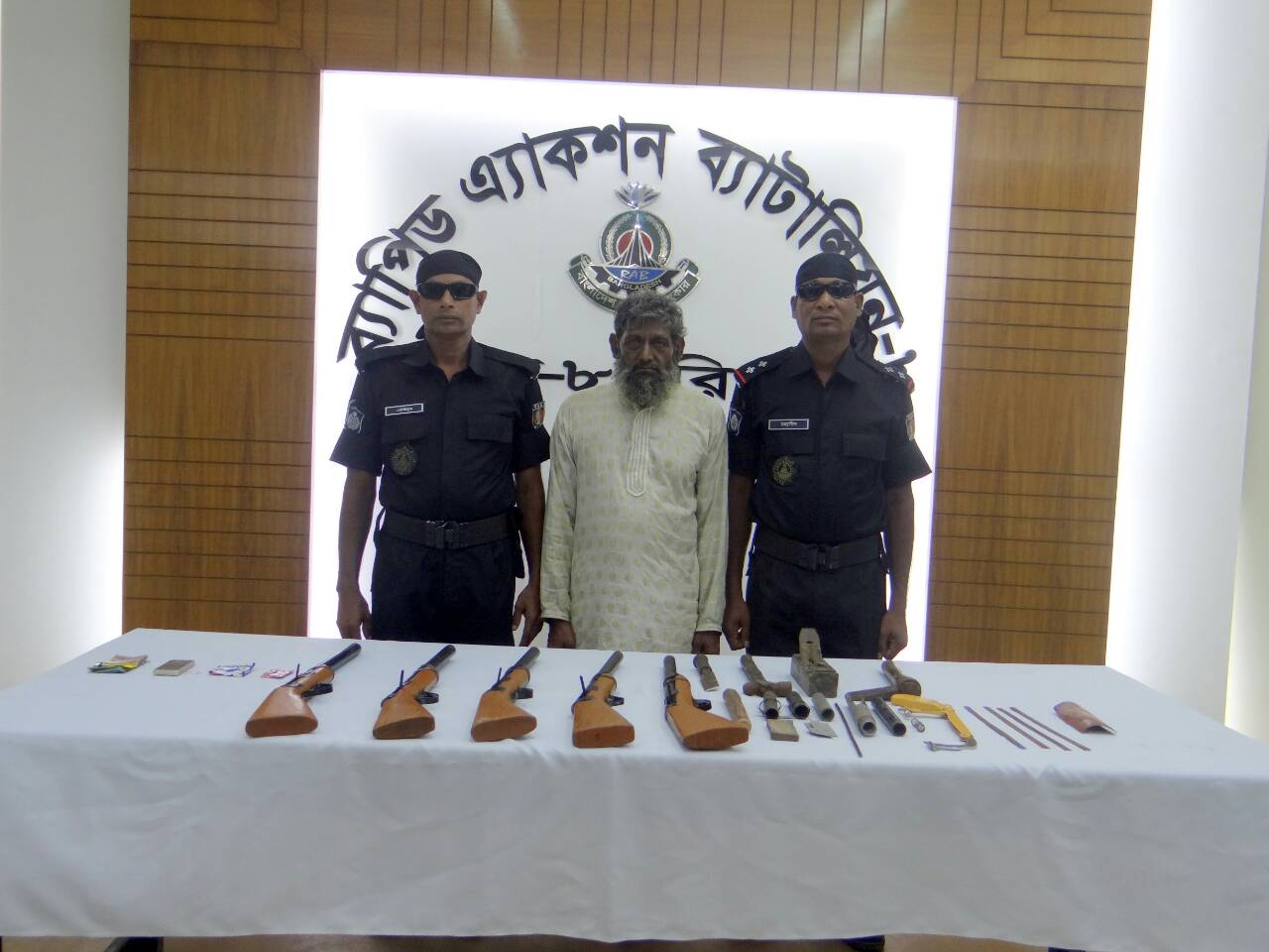 র্যাপিড এ্যাকশান ব্যাটালিয়ান র্যাব-৮ এর অধিনায়ক আতিকা ইসলাম জানান, র্যাব প্রতিষ্ঠালগ্ন থেকেই বনদস্যু, জলদস্যু, ডাকাত, সন্ত্রাসী, চাঁদাবাজ, জঙ্গি দমন, অবৈধ অস্ত্র উদ্ধার, মাদক ব্যবসায়ী, প্রতারকচক্র ও সুন্দরবন দস্যু মুক্তসহ বিভিন্ন অপরাধীদের গ্রেপ্তারে অগ্রণী ভূমিকা পালন করে আসছে। গোয়েন্দা নজরদারী ও আভিযানিক কার্যক্রমের ধারাবাহিকতায় এ ধরণের অপরাধ নিয়ন্ত্রণে র্যাব ইতিমধ্যেই বিশেষ সফলতা অর্জনে সক্ষম হয়েছে। দেশের সার্বিক আইন শৃংখলা পরিস্থিতি ও শান্তি শৃংখলা বজায় রাখার উদ্দেশ্যে র্যাবের অব্যাহত প্রচেষ্টার ধারাবাহিকতায় গত ২৩ জুলাই রাতে র্যাব-৮, বরিশাল এর একটি বিশেষ আভিযানিক দল নিজস্ব গোয়েন্দা তথ্যের ভিত্তিতে একটি সংবাদ পায়। এ গোপন সংবাদের সুত্রে জানতে পারে মংলার বন্দরের পশুর নদীর পাড়ে পিকনিক কর্ণার ঘাট নামক এলাকায় একজন অবৈধ অস্ত্র তৈরি ও সরবরাহকারী অবস্থান করছে। এমন সংবাদের ভিত্তিতে আভিযান দলটি ওই স্থানের কাছাকাছি পৌছালে র্যাবের উপস্থিতি টেরপেয়ে ওই ব্যাক্তি দৌড়ে পালানোর চেষ্ট করে। এ সময় আভিযানে থাকা র্যাবের দলটি ধাওয়া করে তাকে আটক করতে সক্ষম হয়। আটককালে তার নাম মোঃ মজিবর রহমান (৫৫), পিতাঃ মৃতঃ তোফাজ উদ্দিন বলে জানায় এ অস্ত্র তৈরী ও সরবরাহকারী। পরবর্তীতে ঘটনাস্থলে উপস্থিত লোকজন’র সহায়তায় আটক ব্যাক্তির সাথে থাকা প্লাষ্টিকের বর্তি একটি বস্তায় তল্লাশী চালিয়ে ৫টি পাইপগান, ১টি লোহা কাটার মেশিন, ৪টি লোহা কাটার ব্লেড, ১টি স্যান্ড পেপার, ১টি ছোট কুঠার, ১টি ছোট হ্যামার, ৫টি লোহার পাইপ, ১টি বাটালি, ১টি কিনিং রড, ১টি রিকয়েল স্প্রিং, ১টি ছুড়ি, ১টি মোবাইল, ২টি সীম ও নগদ ১,১২৫ টাকা উদ্ধার করা হয়। উদ্ধারকৃত অস্ত্র ও অস্ত্র তৈরির সরঞ্জাম সম্পর্কে জিজ্ঞাসাবাদে কোন বৈধ কাগজপত্র দেখাতে না পেরে এক পর্যায় সে দীর্ঘদিন যাবত দেশের বিভিন্ন এলাকায় অস্ত্র তৈরি করে বিক্রয় করে আসছে বলে স্বীকার করে। এ ব্যাপারে আটককৃত অস্ত্র তৈরী ও সরবারহকারী মজিবুর রহমানকে ও উদ্ধারকৃত মালামালসহ মংলা থানায় সোপর্দ করা হয়েছে। এছাড়াও র্যাব-৮ বরিশাল’র জেলেদের নিরাপত্তা, দস্যু দমন বা এ ধরণের অস্ত্র উদ্ধার অভিযান ইতি পুর্বেও ছিল এখনও চলছে যা ভবিষ্যতেও অব্যাহত থাকবে বলে জানায় র্যাব-৮, এর উপ-অধিনায়ক খানঁ সজিবুল ইসলাম।